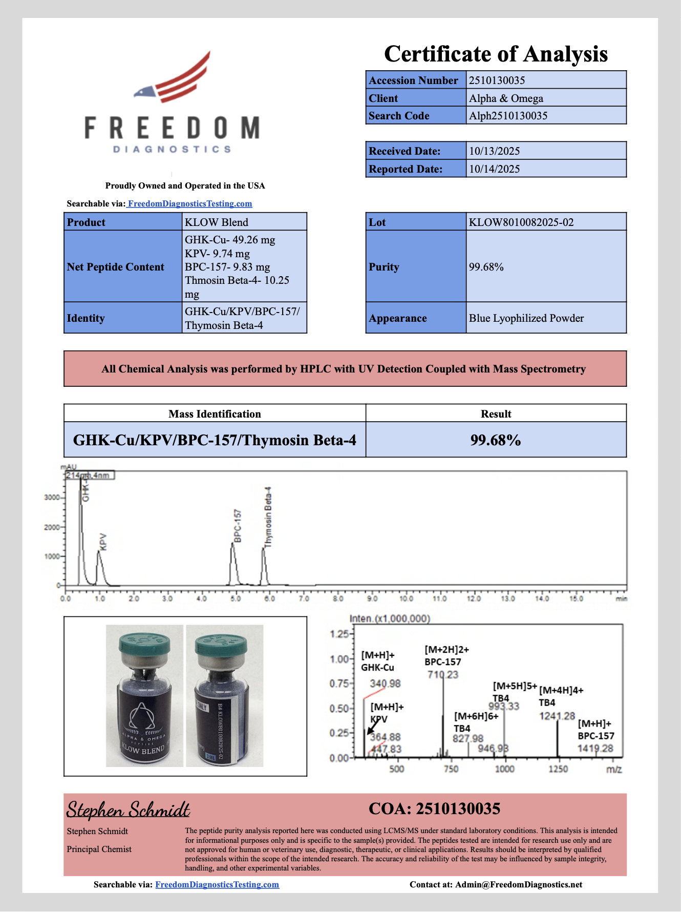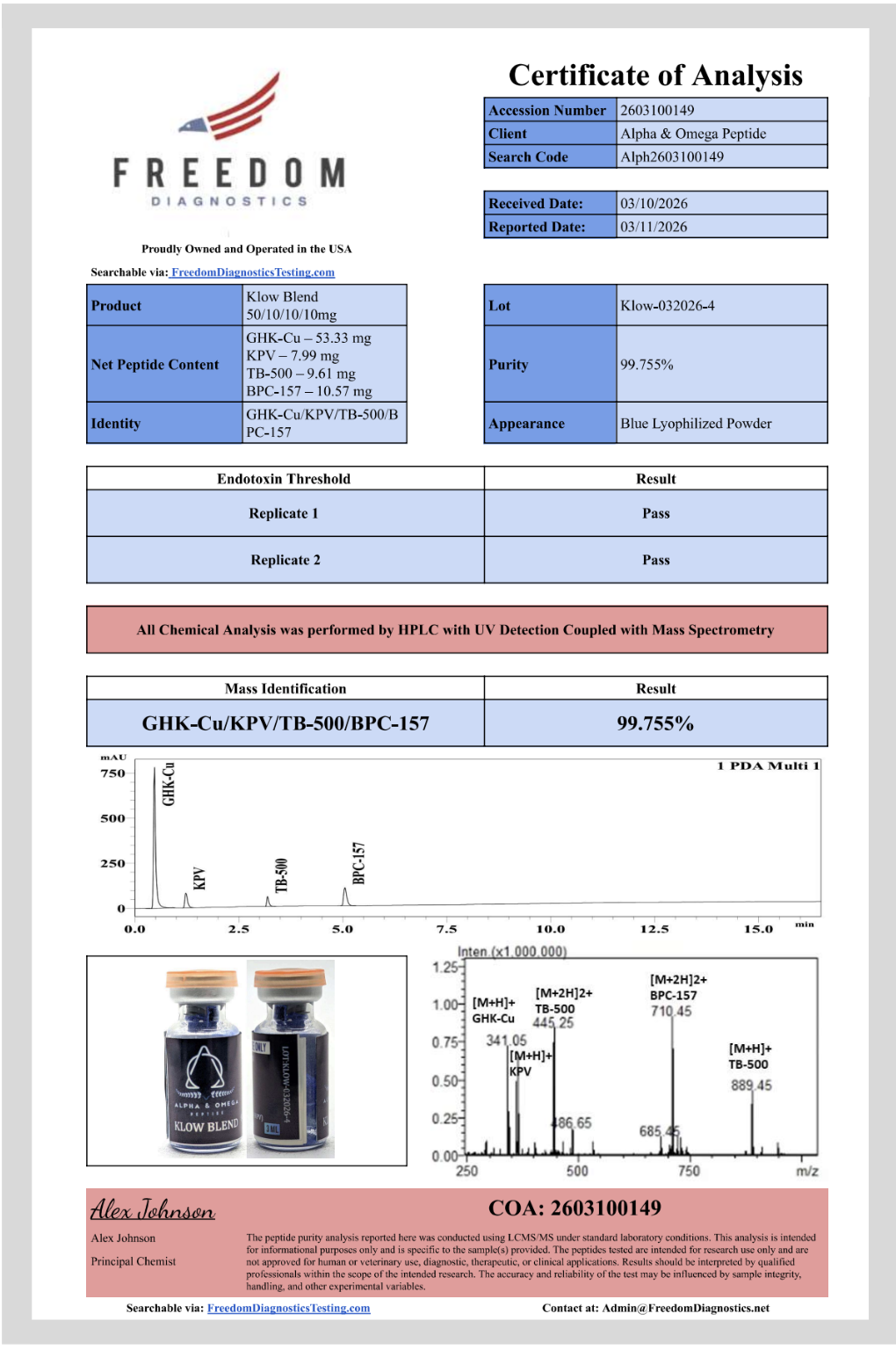 All products on this site are for research and development use only. All products are sold for research, laboratory, or analytical purposes only, and are not for human consumption. Products are not for human consumption of any kind. The statements made on this website have not been evaluated by the US Food and Drug Administration. The statements and the products of this company are not intended to diagnose, treat, cure, or prevent any disease. Alpha Omega Peptide is a chemical supplier. Alpha Omega Peptide is not a compounding pharmacy or chemical compounding facility as defined under 503A of the Federal Food, Drug, and Cosmetic Act. Alpha Omega Peptide is not an outsourcing facility as defined under 503B of the Federal Food, Drug, and Cosmetic Act.