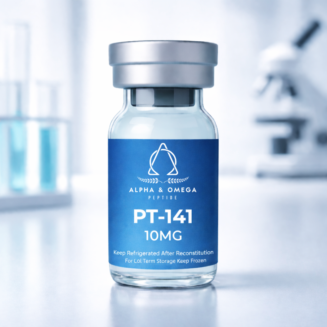 Alpha Omega Peptides supplies PT-141 10MG in a clean, research-grade format intended to support professional laboratory standards. Each vial is prepared to enable accurate handling and reliable preparation while maintaining strict compliance with research-only requirements.